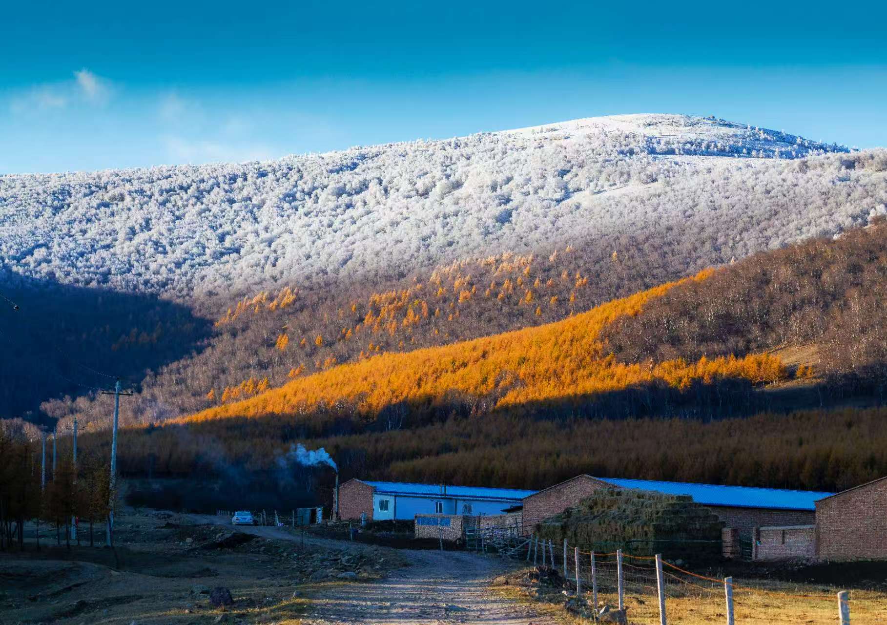 近日,河北省承德市丰宁满族自治县坝上地区迎来降雪。金黄秋叶与皑皑白雪在山坡上交相辉映,构成独特的秋日画卷。