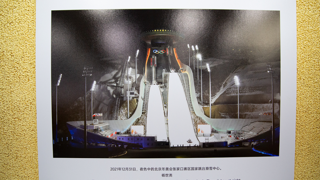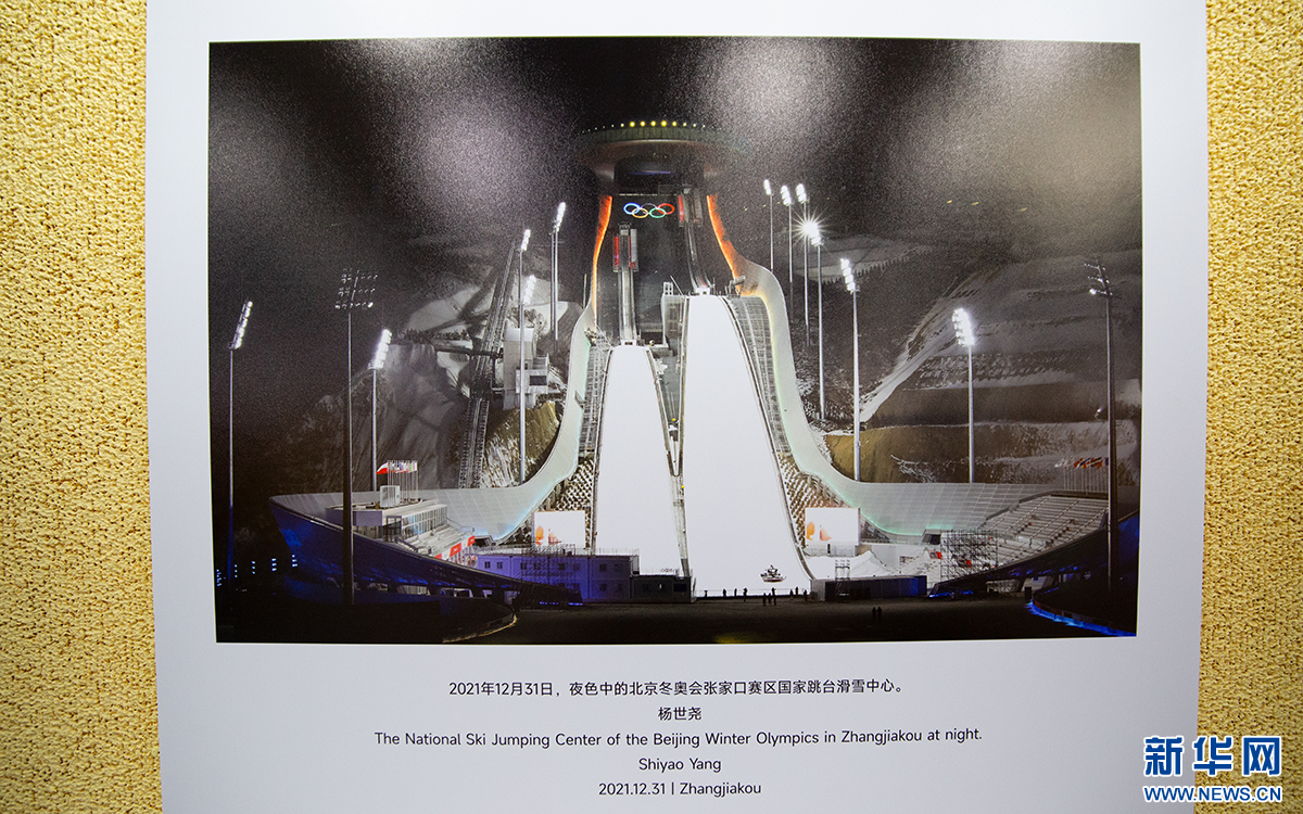 现场展出的2022年北京冬奥会张家口赛区国家跳台滑雪中心图片。新华网 发