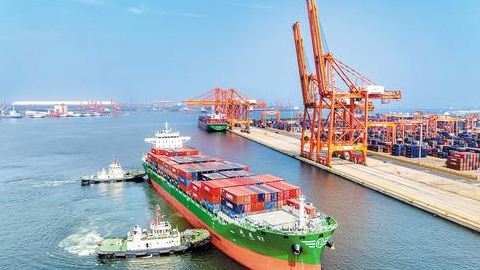 近日,一艘货轮在靠泊唐山港京唐港区集装箱码头。唐山港货物吞吐量稳居世界沿海港口第二。记者 赵杰摄