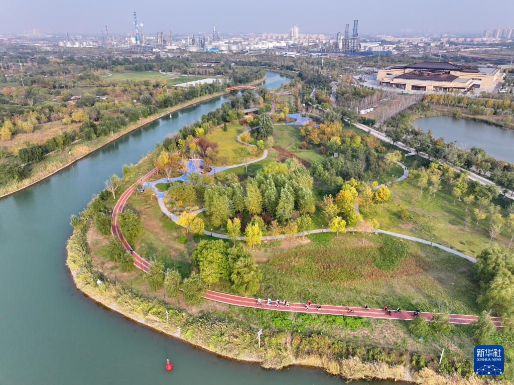 10月30日,市民在河北省沧州市运河区的大运河堤顶路上骑行。