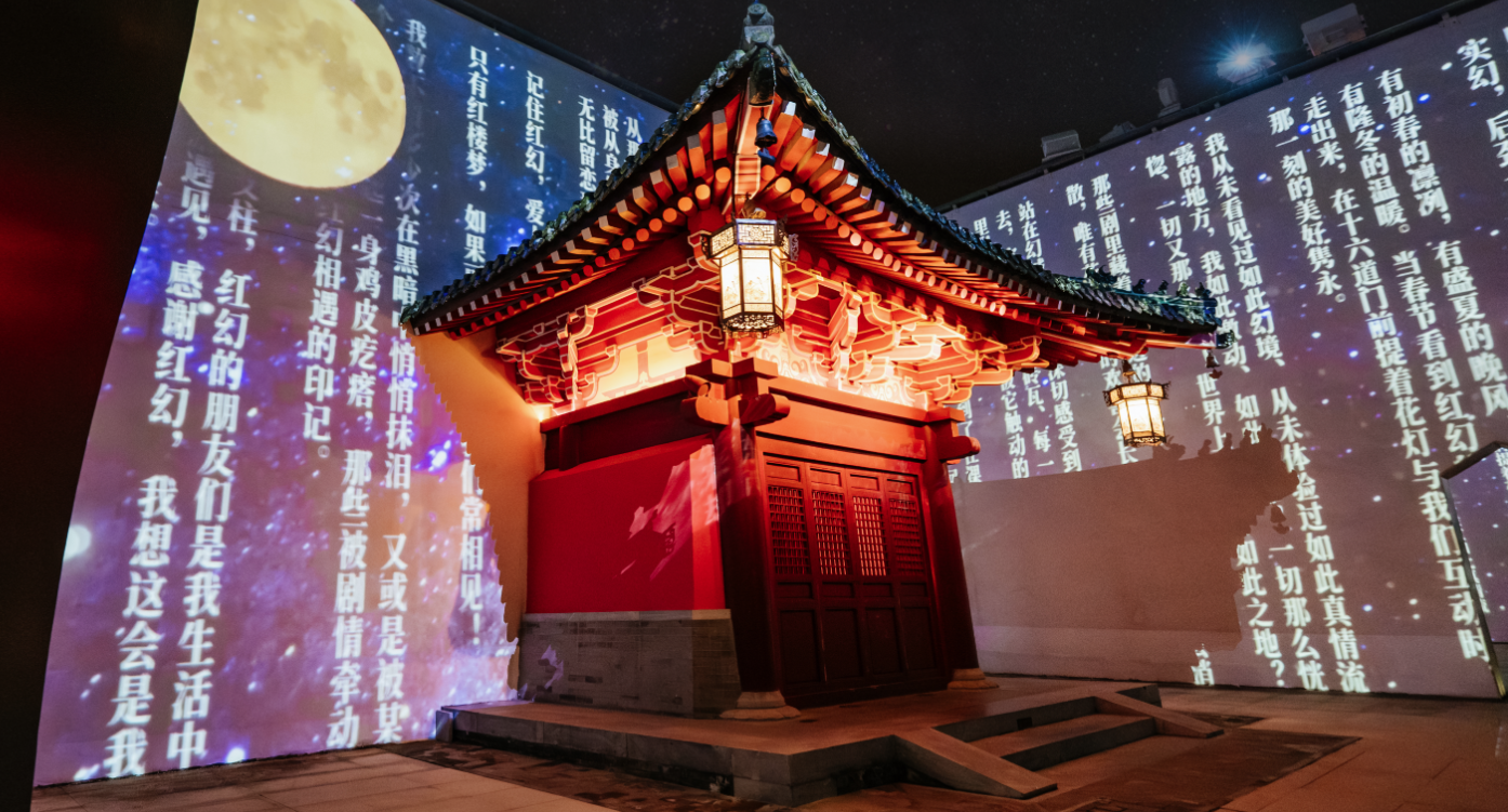 国庆中秋“双节”期间,在只有红楼梦·戏剧幻城上演中秋限定光影秀——“把思绪说给月亮听”。