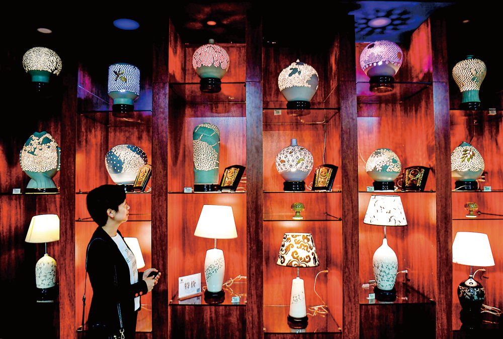 游客在峰峰矿区磁州窑艺术馆参观磁州窑灯罩产品。新华社资料图