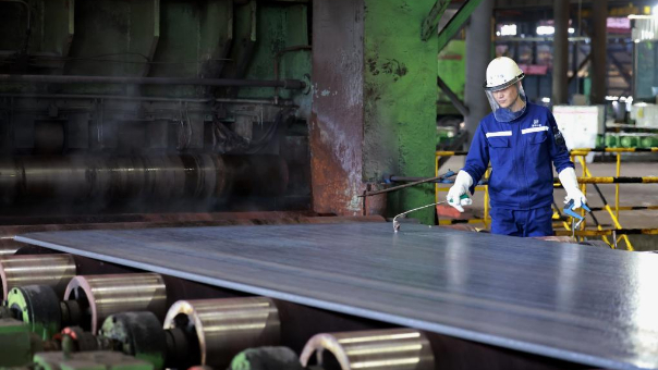 12月26日,工人在唐山海港经济开发区一家船舶用钢企业的生产线上工作。