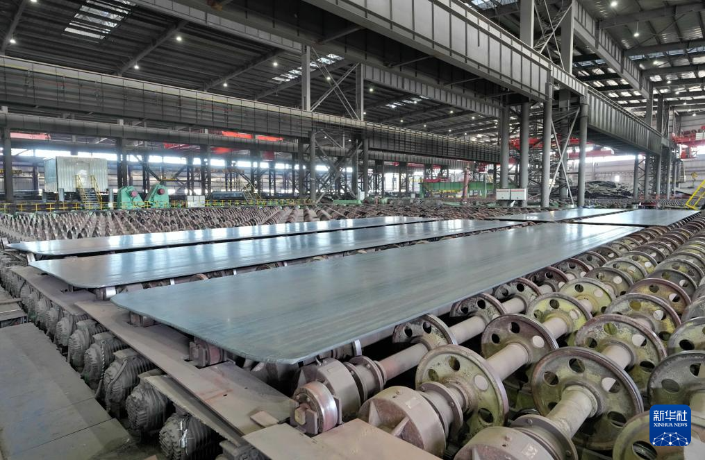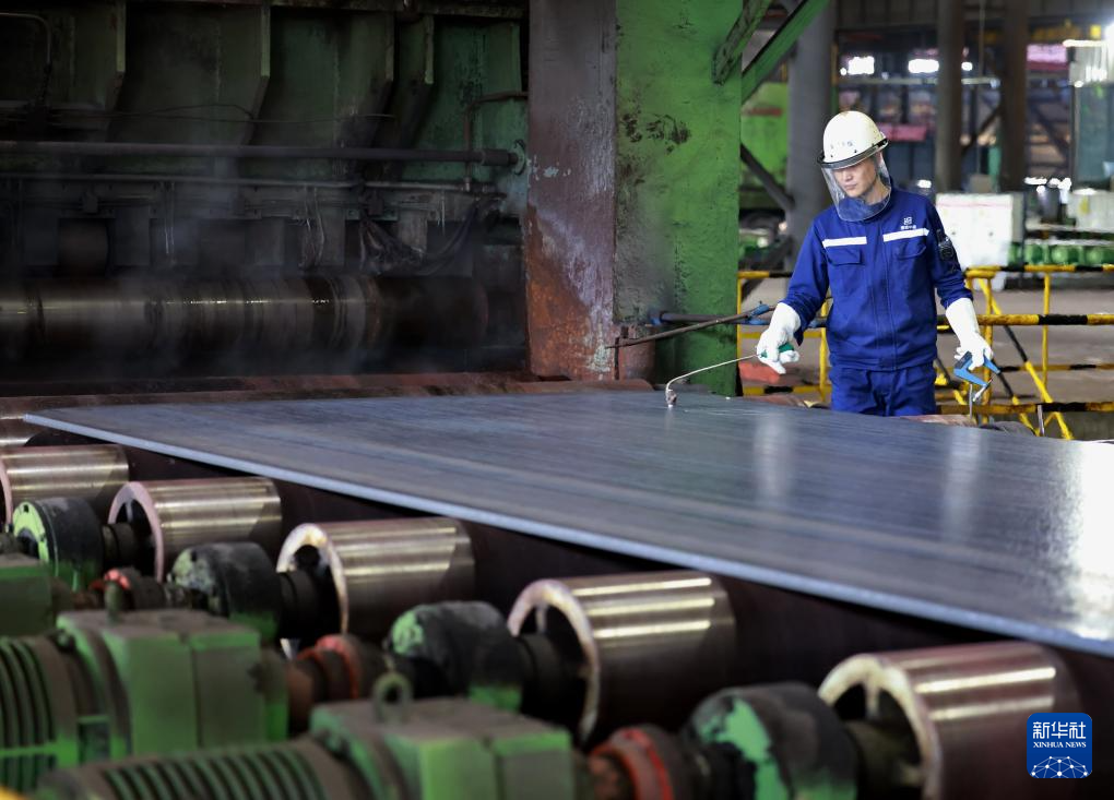 12月26日拍摄的唐山海港经济开发区一家船舶用钢企业生产线上的钢板。