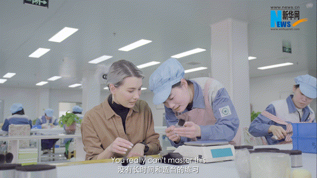 在工厂负责人的陪同下,蒂娜走进生产车间,近距离探访化妆刷的制作过程。从整理梳毛、墩杯塑形,到打造专属刷头,十余名技术工人严格遵循标准化作业流程,对每个环节的细节把控都近乎苛刻。一支支毛刷的制作过程,更像是一次次精雕细琢的艺术创作。