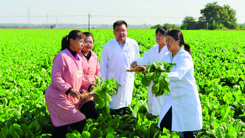 在石家庄市元氏县南因镇南因庄村的一片菊苣种植地里,农学专家们现场授课。(资料图片)记者 董永博 摄